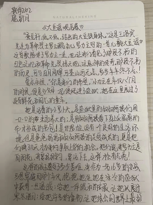 課堂上,學生們通過老師講述和兒童劇《大豆謠》的經典片段演出,詳細了解了1940年6月,由于叛徒出賣,時任中共甘肅工委副書記羅云鵬和妻子樊桂英以及他們出生8個月的女兒羅力立被捕入獄,小力立就此開始了長達6年多的牢獄生活的勵志故事。整堂課程通過觀、演、寫、唱、評、訪等形式,感悟《大豆謠》蘊含的紅色精神,雖然全程只有短短40多分鐘,但這個本土紅色故事無疑為蘭州的廣大中小學生照亮了理想和未來。在觀看過程中,同學們神情專注,被視頻中所展現的人物精神所感動。觀看結束后,學校還組織學生認真撰寫心得體會。同學們紛紛表示:一定要感恩現在這來之不易的和平、幸福。要在今后的學習生活中不斷充實自己,為建設偉大祖國、美好家鄉貢獻青春力量。